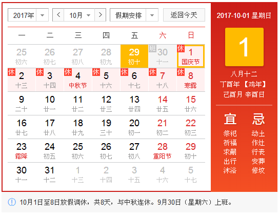 2017年10月1日(星期日)至2017年10月8日(星期日)調休放假共8天,其中9月30日(星期六)調休上班,10月9日(星期一)開始正常上班。