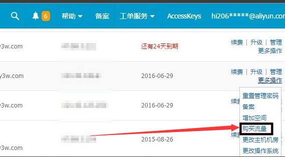 購買方法:例如購買50G或100G流量,必須是50G的整數(shù)倍。登錄后臺(tái),到虛擬主機(jī)中,點(diǎn)業(yè)務(wù)后面的:更多操作,如下圖: