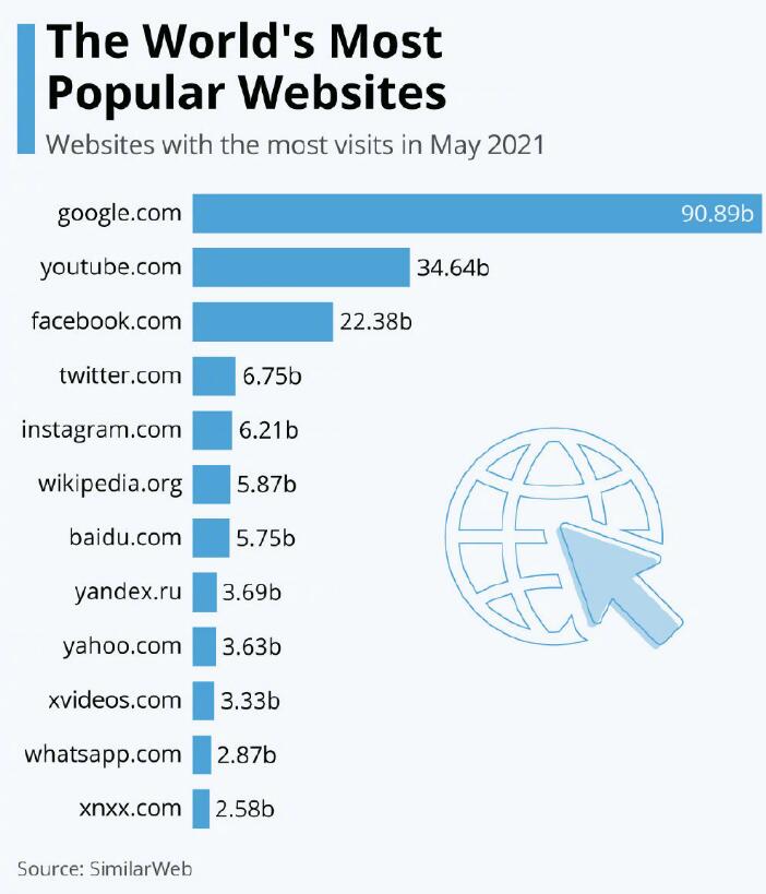 以下是SimilarWeb統計的2021中季度全球訪問量最高的網站排行榜單: