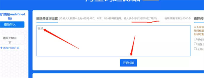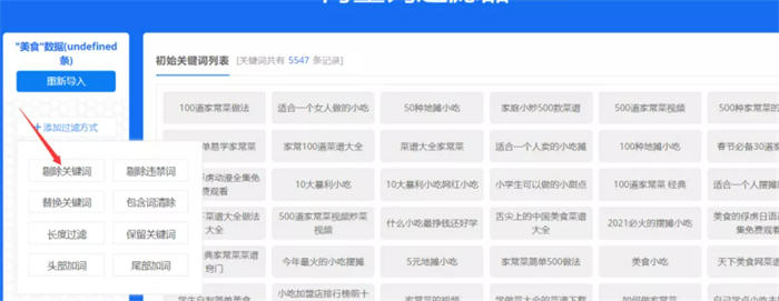 過濾掉一些你不要的詞語,比如我這批美食標(biāo)題里面,有一些是帶有「視頻」的標(biāo)題,我不需要這樣的標(biāo)題,我就可以輸入「視頻」兩個(gè)字,就可以過濾掉全部帶有「視頻」兩個(gè)字的標(biāo)題。