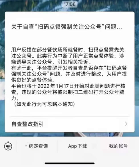 問題的通知:平臺提醒開發者自查是否存在“掃碼點餐強制公眾號”問題,并及時進行整改,為用戶提供良好的點餐體驗;