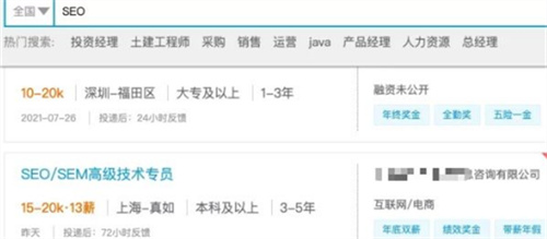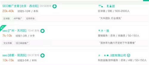 說實(shí)話,在把SEO基礎(chǔ)教程、百度搜索排名因素以及百度搜索流量寫完,大家看到更多是不是各平臺(tái)SEO流量玩法?其實(shí),關(guān)于SEO還有沒有前途一直有人在問,我之前寫過,末尾相關(guān)推薦。那么關(guān)于SEO從業(yè)待遇如何呢?我們先隨機(jī)看看幾個(gè)招聘平臺(tái)關(guān)于SEO工資待遇哈,如圖:
