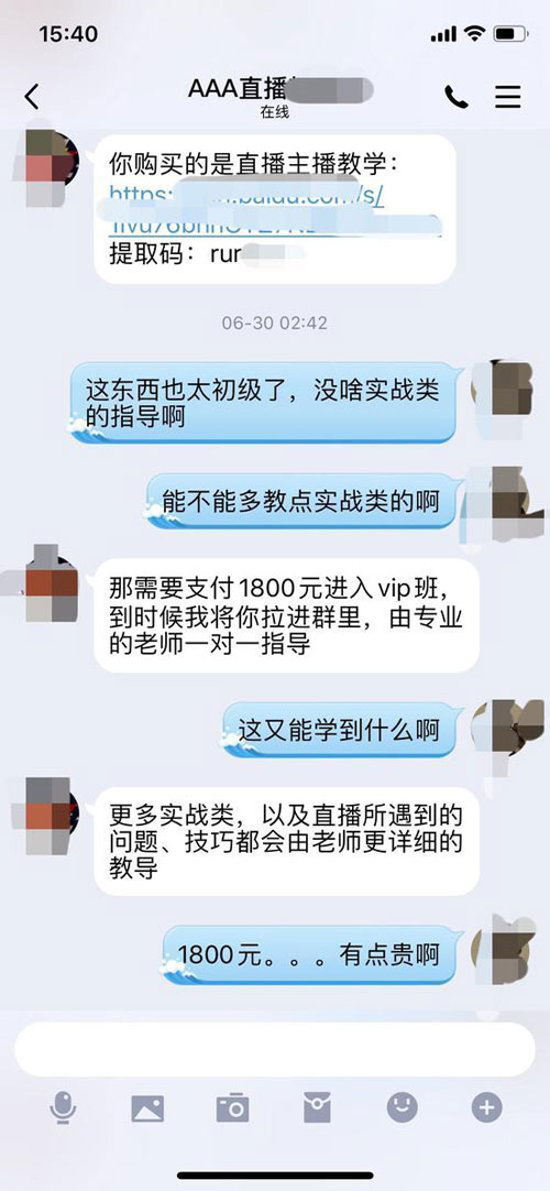 記者注意到,這套標注著“基礎入門”、“導流方案”、“賣貨思維”等文件的課程,僅是極為簡單地介紹了直播過程中需注意的事項,并沒有任何實操課程。當記者以“課程過淺”,提出希望能多學點干貨時,對方稱89元只是基礎培訓的費用,如果要學到更多的實戰(zhàn)類技巧,則需要再支付1800元加入VIP班。