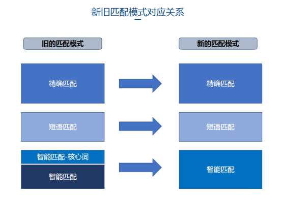 升級后的匹配模式變成了三種:精確匹配,短語匹配,智能匹配。