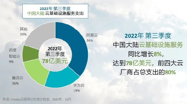科技市場獨立分析機構Canalys今日發布數據稱,2022年第三季度,中國大陸的云基礎設施服務支出同比增長8%,達到78億美元,占全球云支出的12%。自2022年第一季度以來,年增長率已經連續三個季度放緩,首次跌破10% 。