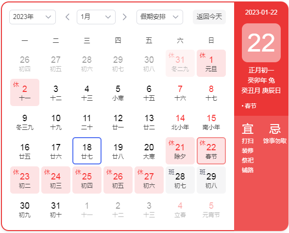 2023年1月19日(農歷臘月二十八)至2023年1月28日(農歷正月初七),共十天,2023年2月29日(農歷正月初八)正式上班。